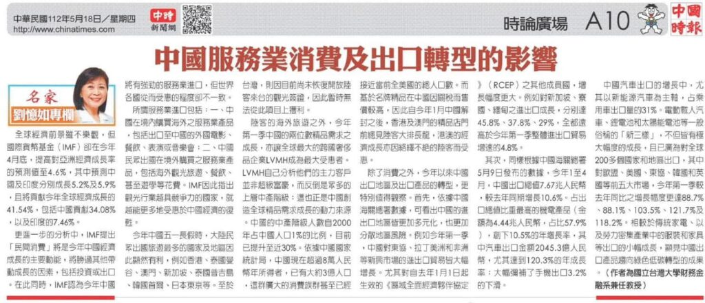 除了消費之外,今年以來中國出口地區及出口產品的轉型,更特別值得觀察。首先,依據中國海關總署數據,可看出中國的進出口地區皆更加多元化,也更加分散地區風險。例如今年第一季,中國對東協、拉丁美洲和非洲等新興市場的進出口貿易皆大幅增長。尤其對自去年1月1日起生效的《區域全面經濟夥伴關係協定》(RCEP)之其他成員國,增長幅度更大。例如對新加坡、寮國、緬甸之進出口成長,分別達45.8%、37.8%、29%,全都遠高於今年第一季整體進出口貿易增速的4.8%。