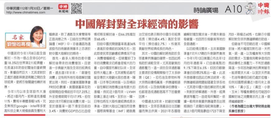 中國今年1月8日起全面解封。作為一個占全球GDP比重18.3%的世界第2大經濟體,在長達3年防疫封關後的重新開放,影響自然巨大;尤其是對於正處於通膨與衰退兩難之間的全球經濟,更將引發關鍵性轉折效應。