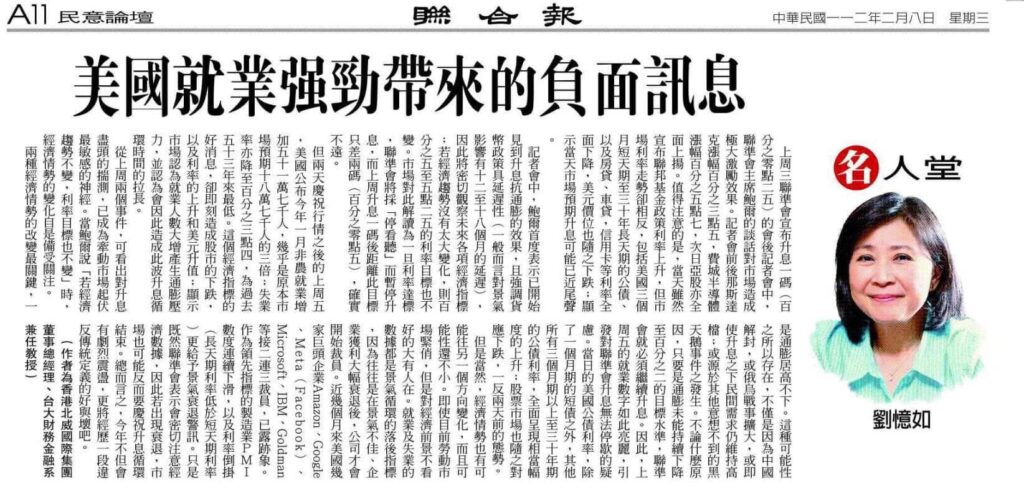 但兩天慶祝行情之後的上週五,美國公布今年1月非農就業增加51萬7千人,幾乎是原本市場預期18萬7千人的三倍;失業率亦降至3.4%,為過去53年來最低。這個經濟指標的好消息,卻即刻造成股市的下跌,以及利率的上升和美元升值;顯示市場認為就業人數大增產生通膨壓力,並認為會因此造成此波升息循環時間的拉長。