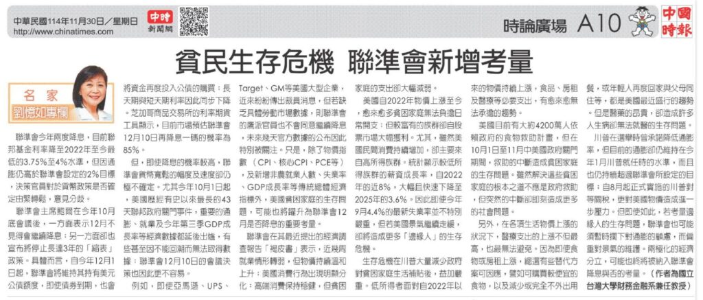 劉憶如/香港北威國際集團董事總經理、台灣大學財金系兼任教授 2025.11.30,中國時報 A10版 聯準會今年兩度降息,目前聯邦基金利率降至2022年至今最低的3.75%至4%水準,但因通膨仍高於聯準會設定的2%目標,決策官員對於貨幣政策是否確定由緊轉鬆,意見分歧。 聯準會主席鮑爾在今年10月底會議後,一方面表示12月不見得會繼續降息;另一方面卻也宣布將停止長達3年的「縮表」政策。具體而言,自今年12月1日起,聯準會將維持其持有美元公債額度,即使債券到期,也會將資金再度投入公債的購買;長天期與短天期利率因此同步下降。芝加哥商品交易所的利率期貨工具顯示,目前市場預估聯準會12月10日再降息一碼的機率為85%。 但,即使降息的機率較高,聯準會貨幣寬鬆的幅度及速度卻仍極不確定。尤其今年10月1日起,美國歷經有史以來最長的43天聯邦政府關門事件,重要的通膨、就業及今年第三季GDP成長率等經濟數據都延後出爐,有些甚至因不能回溯而無法取得數據;聯準會12月10日的會議決策也因此更不容易。 例如,即使亞馬遜、UPS、Target、GM等美國大型企業,近來紛紛傳出裁員消息,但若缺乏具體勞動市場數據,則聯準會的鷹派官員也不會同意繼續降息,未來幾天官方數據的公布因此特別被關注。只是,除了物價指數 (CPI、核心CPI、PCE等),及新增非農就業人數、失業率、GDP成長率等傳統總體經濟指標外,美國貧困家庭的生存問題,可能也將躍升為聯準會12月是否降息的重要考量。 聯準會在其最近提出的經濟調查報告「褐皮書」表示,近幾周就業情形轉弱,但物價持續溫和上升;美國消費行為出現明顯分化:高端消費保持穩健,但貧困家庭的支出卻大幅減弱。 美國自2022年物價上漲至今,愈來愈多貧困家庭無法負擔日常開支;但較富有的族群卻自股票市場大幅獲利。尤其,雖然美國民間消費持續增加,卻主要來自高所得族群。統計顯示較低所得族群的薪資成長率,自2022年的近8%,大幅且快速下降至2025年的3.6%。因此即使今年9月4.4%的最新失業率並不特別嚴重,但若美國景氣繼續走緩,卻將造成更多「邊緣人」的生存危機。 生存危機在川普大量減少政府對貧困家庭生活補貼後,益加嚴重。低所得者面對自2022年以來的物價持續上漲,食品、房租及醫療等必要支出,有愈來愈無法承擔的趨勢。 美國目前有大約4200萬人依賴政府的食物救助計畫,但在10月1日至11月中美國政府關門期間,救助的中斷造成貧困家庭的生存問題。雖然解決這些貧困家庭的根本之道不應是政府救助,但突然的中斷卻即刻造成更多的社會問題。 另外,在各項生活物價上漲的狀況下,醫療支出的上漲不但最高,也最無法避免。因為即使食物或房租上漲,總還有些替代方案可因應,譬如可購買較便宜的食物,以及減少或完全不外出用餐,或年輕人再度回家與父母同住等,都是美國最近盛行的趨勢。但是醫藥的昂貴,卻造成許多人生病卻無法就醫的生存問題。 川普在選舉時曾承諾降低通膨率,但目前的通膨卻仍維持在今年1月川普就任時的水準,而且也仍持續超過聯準會所設定的目標;自8月起正式實施的川普對等關稅,更對美國物價造成進一步壓力。但即使如此,若考量邊緣人的生存問題,聯準會也可能須暫時擱下對通膨的顧慮,而偏重對景氣的維護。兩極化的經濟分立,可能也終將被納入聯準會降息與否的考量。 (作者為香港北威國際集團董事總經理、國立台灣大學財務金融系兼任教授)