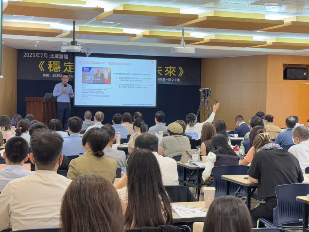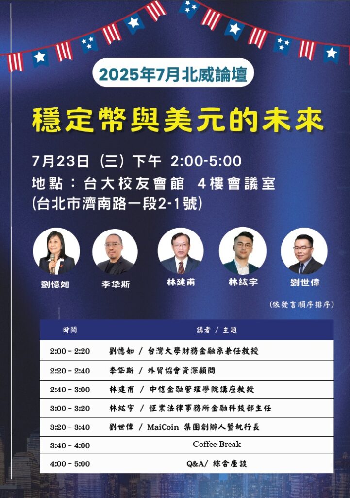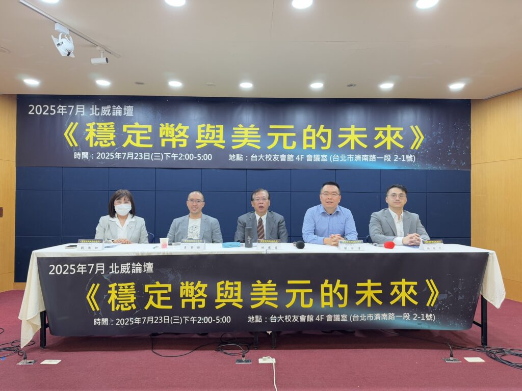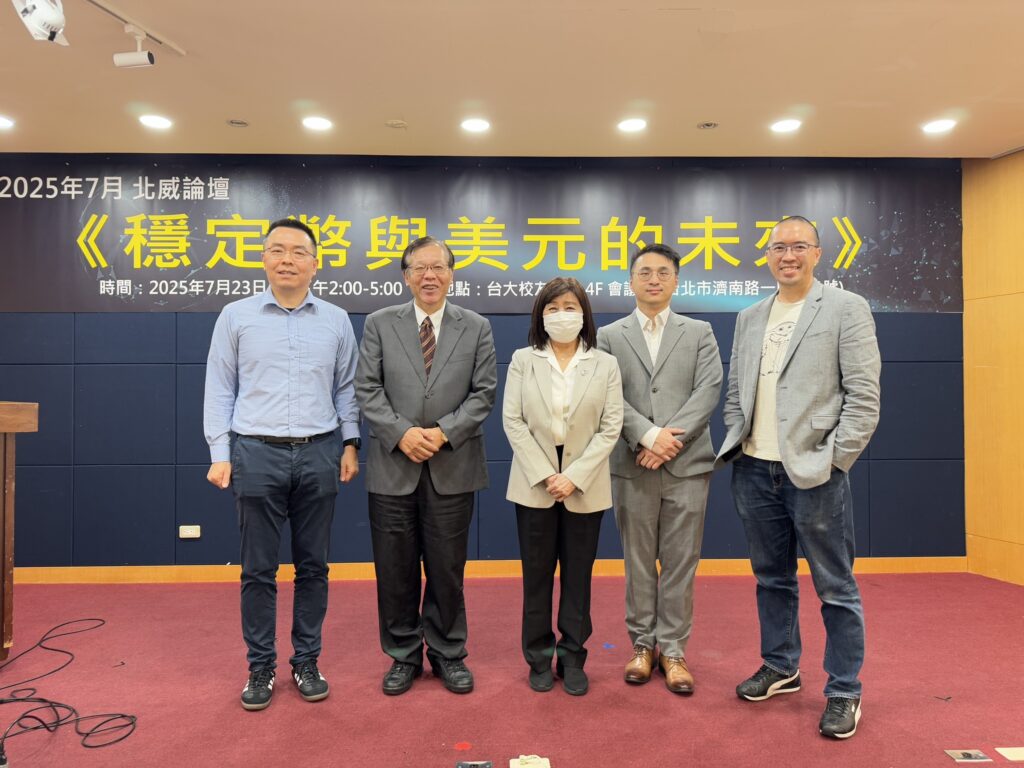 【2025.7.23】北威以「穩定幣與美元的未來」為主題舉辦論壇。本次論壇邀請台灣大學財務金融系兼任教授劉憶如、外貿協會資深顧問李牮斯、中信金融管理學院講座教授林建甫、恆業法律事務所金融科技部主任林紘宇,以及MaiCoin集團創辦人暨執行長劉世偉。